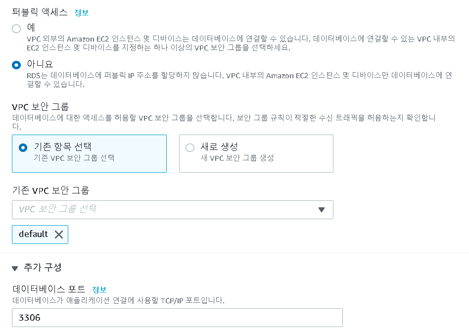 그리고 여기서 추가구성에서 포트번호를, 우리가 보안그룹에서 만든 접속 포트번호와 동일하게(위에서 5432 했으니 여기서도 5432!) 만들어주면 된다.