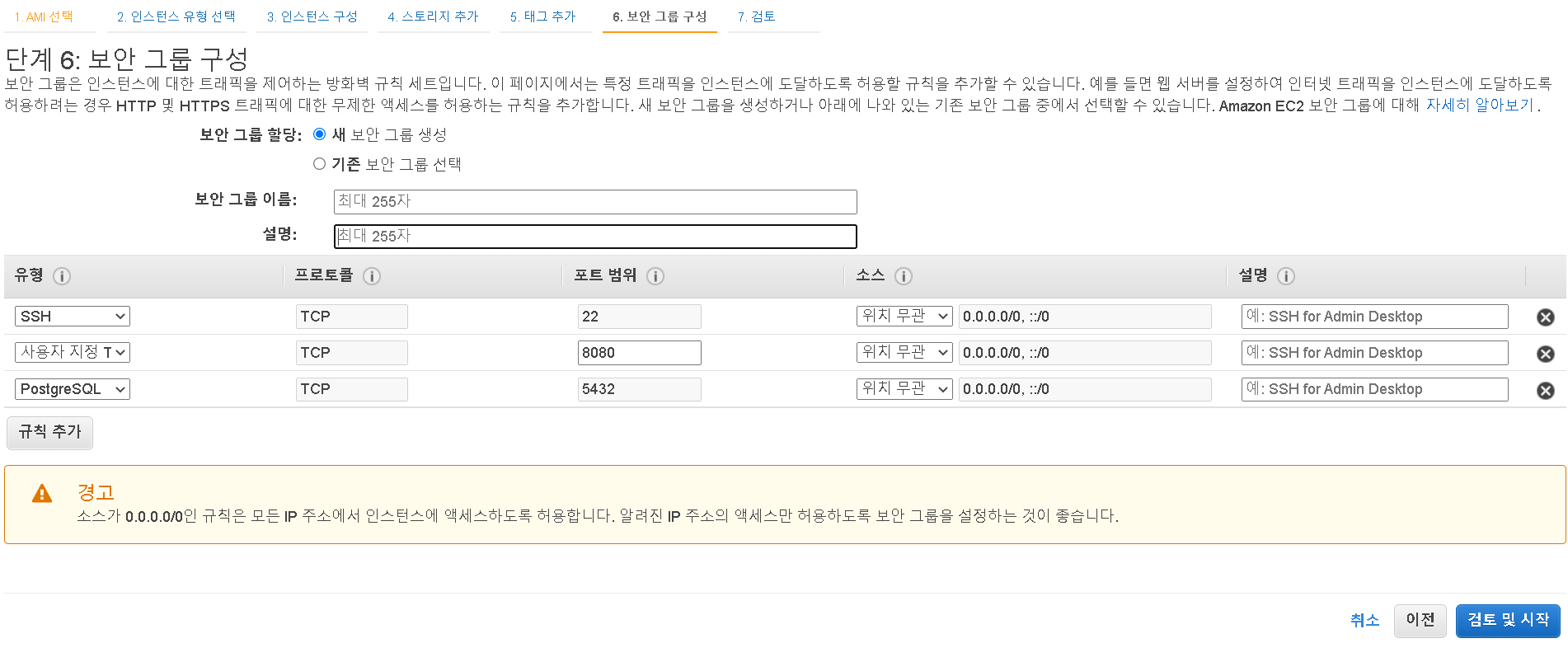 우리는 이 보안경고창 아래 보이는 보안그룹편집을 눌러서, 추가적인 보안그룹을 구성해줄 것이다.