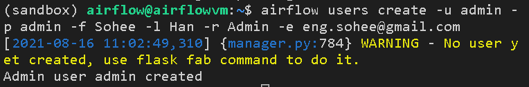 airflow users create -u admin -p admin -f Sohee -l Han -r Admin -e eng.sohee@gmail.com