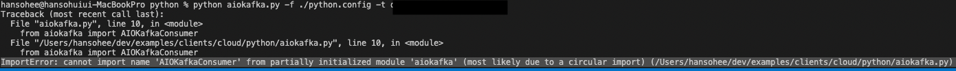 내가 실행하고자 했던 파일명이 aiokafka.py 였고, 그 안에 import aiokafka 명령이 실행되고 있었기 때문에, 이름이 충돌하여 발생한 이슈다.