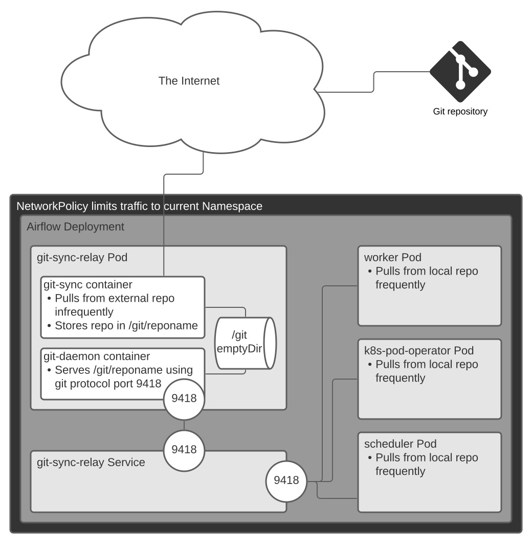 airflow에서도, 운영을 하기 위해서는 단발성의 배포만 하진 않을 것이다. (dag가 변경될 때마다 pod를 죽이고 다시 생성할 수도 없을 것이다.) 따라서, airflow를 운영하기 위해서는, 꾸준히 dags들의 변경사항을 업데이트 하는 과정이 필요하다. 이때, git-sync를 사용할 수 있다.