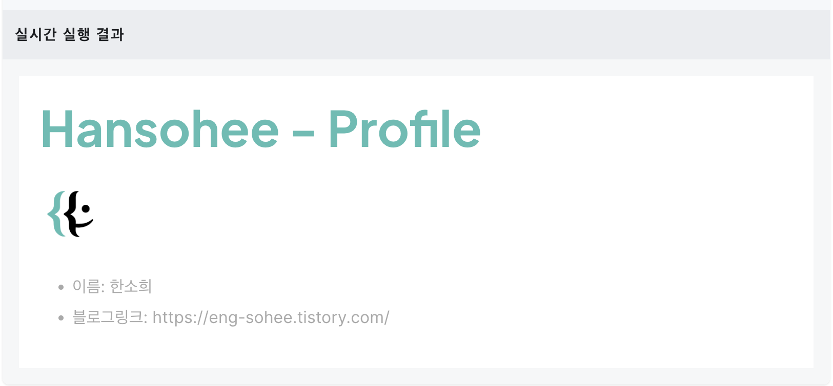 재밌어서 하나 더 해봤는데, 아래와 같이 코드 스니펫에 변수값을 내가 마음대로 바꾸면, 아래 '실시간 실행결과'에서 즉시 반영된다.