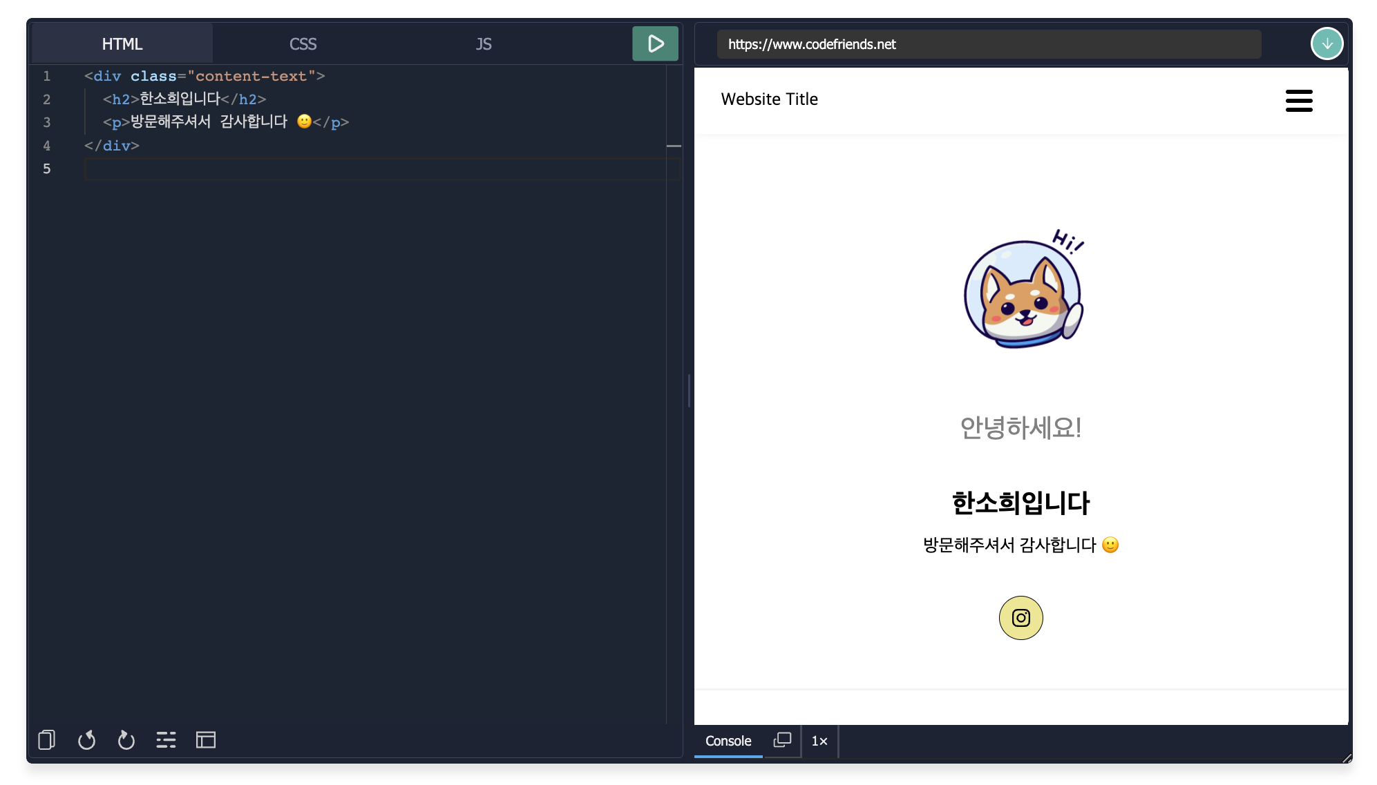 사진과 같이, 위 웹 문서 내 코드 편집 및 실시간 확인이 가능하다. 수정을 하면 웹사이트에서 바로 변경된 결과가 반영된다.