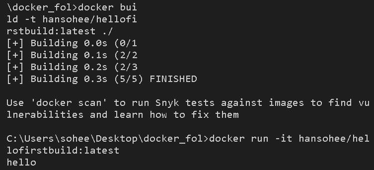 그러면 이제 docker run -it 도커아이디/이미지이름:버전 이라는 명령어를 주어, 실행해보자.