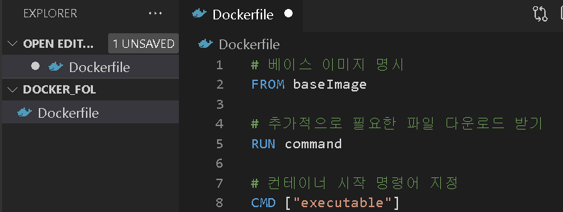 이를 VSCode에서 실현하면, 위와 같은 그림으로써 만들어진다. 이제 도커파일의 뼈대가 완성된 것이다!